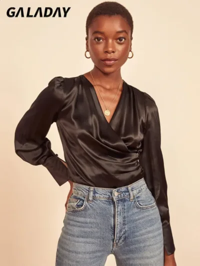 Black Series, BLOUSE, Casual, CLOTHING, COMMUTING, Going Out, SHOP BY COLOR, SHOP BY OCCASION, SHOP BY STYLE, SHOP BY TREND, Solid ColorGALADAY Satin Blouse Retro Style